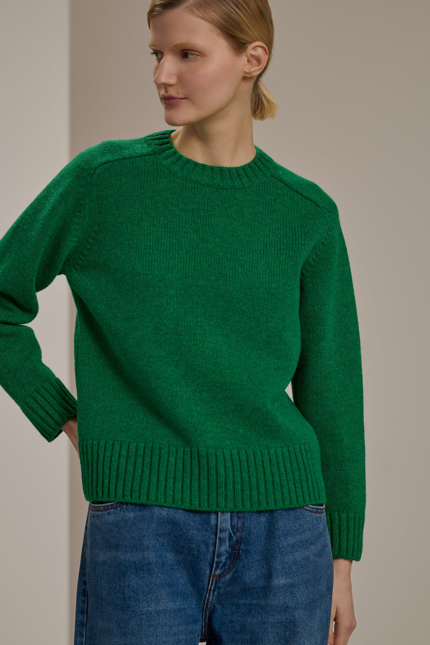 ENVIE is an alpaca and wool jumper, a true icon of our collections. Its fit is classic and straight, with a round neckline that sits away from the neck and raglan armholes giving it a subtly relaxed look, while the voluminous and slightly fluffy knit provides softness and flexibility.